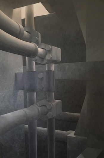 This series emerged from my growing fascination with the inner-workings of heavy machinery - the “guts” (pipes, gears and steel forms). My initial interest concerned their form and structure, however this evolved to include and investigate the negative spaces they create. Every alcove created between a machine’s various forms holds a unique set of contradictions - darkness and light, danger and safety, chaos and order. In this series, I seek to identify, sharpen and evoke these emotionally relevant dualities.